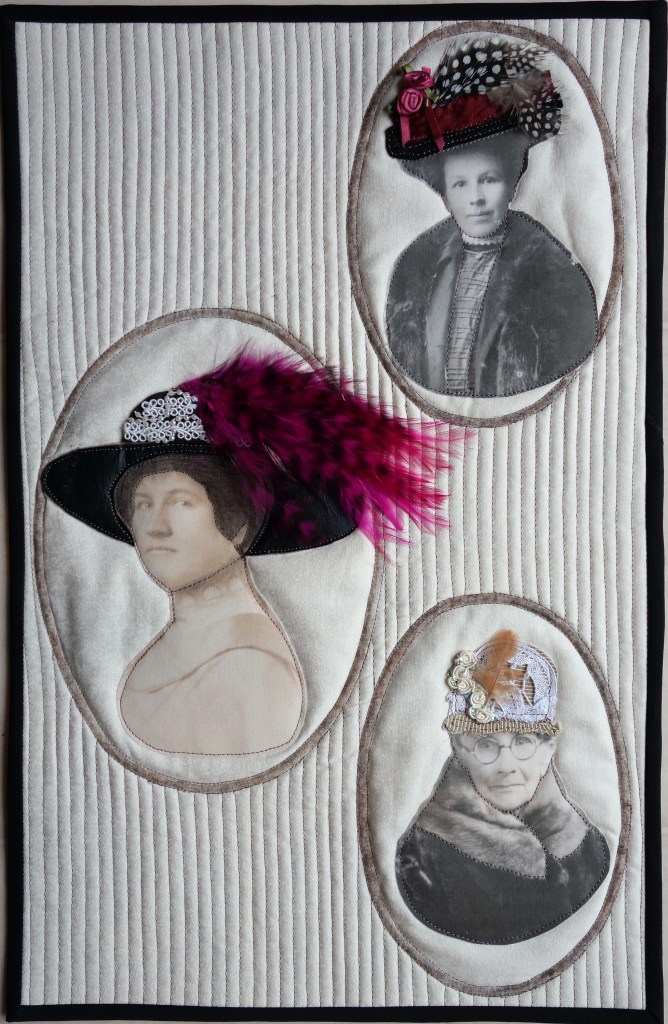A number of the women in my family made hats. When I discovered this fact I used it to make a memory of my own involving three of my ancestors with their hats. I was in an art quilt group, we made small pieces around a theme. I liked these three. the top right is Margaret (Crowe) Hoyer, she was my 1rst cousin 2x removed. The middle one is my grandmother Nettie Myrtle Smith and the bottom is my great grand aunt Elizabeth (Robertson) Crowe.