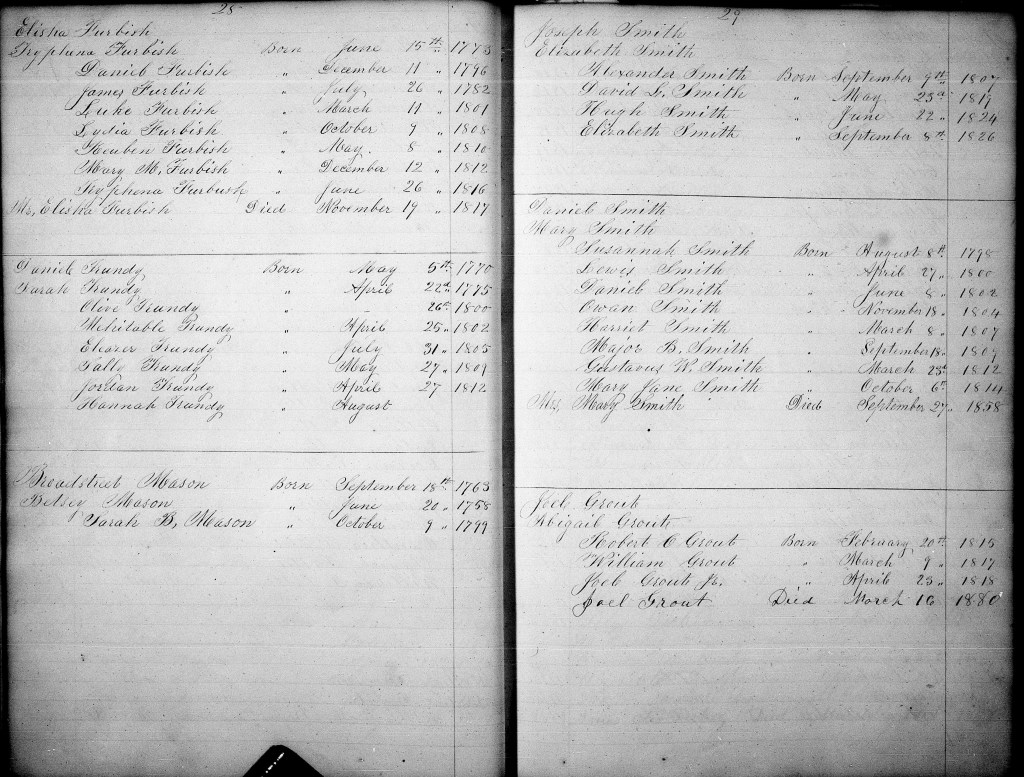 Here is another example of how extended family helped me solve a puzzle. I knew my 4th great grandfather was named Daniel Smith (1775-1864) and I knew his wife was named Mary. Finding Mary’s surname was I thought not going to happen. I found this family record on Family Search. It lists the parents and each of their children along with their birthdates and even the death of Mary. But still she is listed as Mary Smith! I began paging through the individusl records one by one. I kept finding each birth Certificate and each had the mother listed as Mary~.