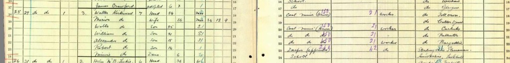My Scottish ancestors often had extended family in their homes. The partial Census I have posted here is the home of my 3rd great grandparents, Nicol Kirkwood and Elizabeth (Craig) Kirkwood. This Census is from 1841 in Old Monkland, Scotland. The first two are Nicol and Elizabeth, next is George, my second great grandfather who is 21. Nicol and George are both Colliers, meaning coal miners. There are four more siblings of George. Elizabeth, 15 is a servant. Grace is 12 and does not yet have an occupation. Walter is 10 and is also a collier, and Janet is 6. There are two more family members living in their home. Janet (Ferguson) Craig at 85, is the mother of Elizabeth (Craig) Kirkwood. The final one surprised me and took me a little while to find the double connection. Helen Guy is the niece of Elizabeth (Craig) Kirkwood. Helen Guy and George Kirkwood, my second great grandfather marry in 1841. With the 10 year old of Nicol and Elizabeth already at work in the mines, I am assuming they were not a wealthy family. It happens quite often that elder family members are living with one of their children even when they probably do not have the space or the funds. Family is supported.