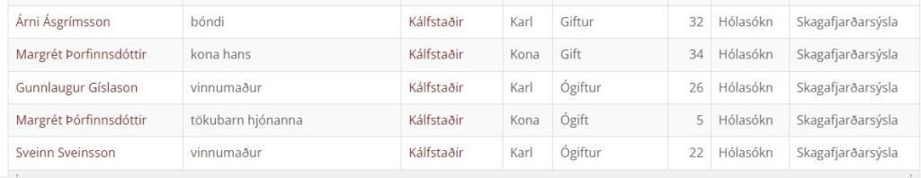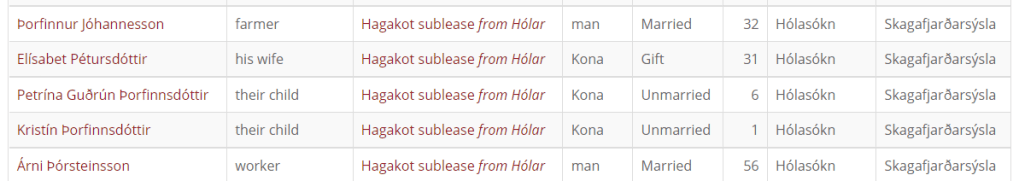 In the 1870 Census Thorfinnur and Elisabet are subleasing a farm and have two of their daughters, Petrina and Kristin, living with them. In 1870 they actually have 4 children. I’ve been told that it was pretty common for children to live with other relatives who didn’t have children or had enough space for more children. I found their daughter Margret with a first cousin of Thorfinnur, listed as ‘tökubarn hjónanna’ or adopted child of the couple.