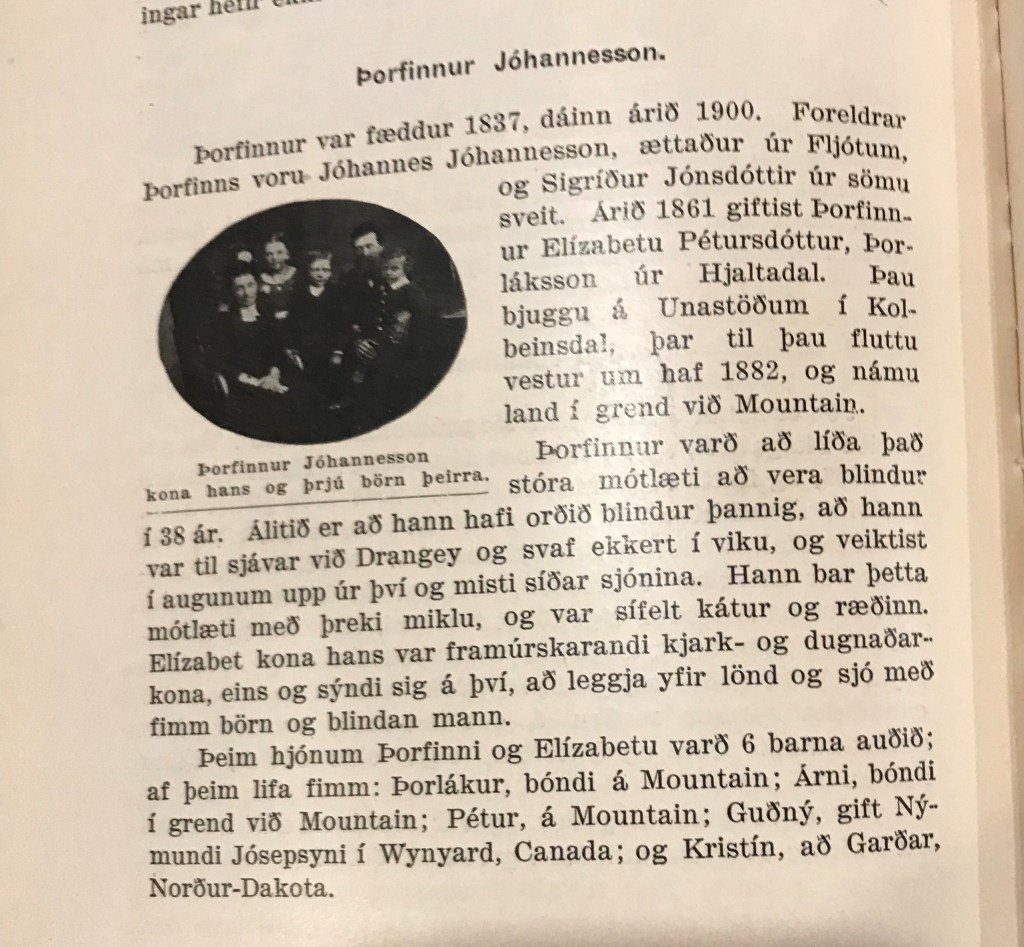 Here is a quote from Gudny Thorfinnsdottir about the family trip from Iceland to America. “Now with a blind husband, a sick child, very little means to meet their needs, they started out on their journey. But after all Mother did not stand alone. She had set her mind on what God would do for her. Father and Mother came through victorious.” Their faith helped them reach their destination to build a better life for their familiy.