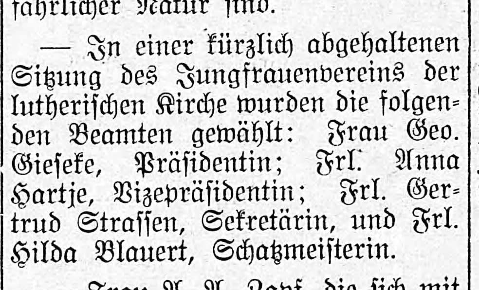 I was excited when I discovered her name in a German newspaper from New Ulm. I thought I might be able to translate using my new skills. Ha! I discovered newspaper script is different from handwritten script and some of these words didn’t come up in my class. I did figure out it was something held at the Lutheran Church and the following became chosen officials. Luckily I also found it in an English newspaper from New Ulm because the big long word in the second line was one I didn’t know and I tried using google translate. It gave me maiden cleanse. I was hoping that wasn’t right.