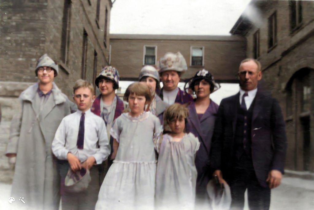 My mom and her sister are the two young girls in the front, Myrtle, their mom is the tallest woman in the back. The man is George Kirkwood, my grandfathers brother and the boy is his son. This was taken at the orphanage in Mason City, Iowa.
