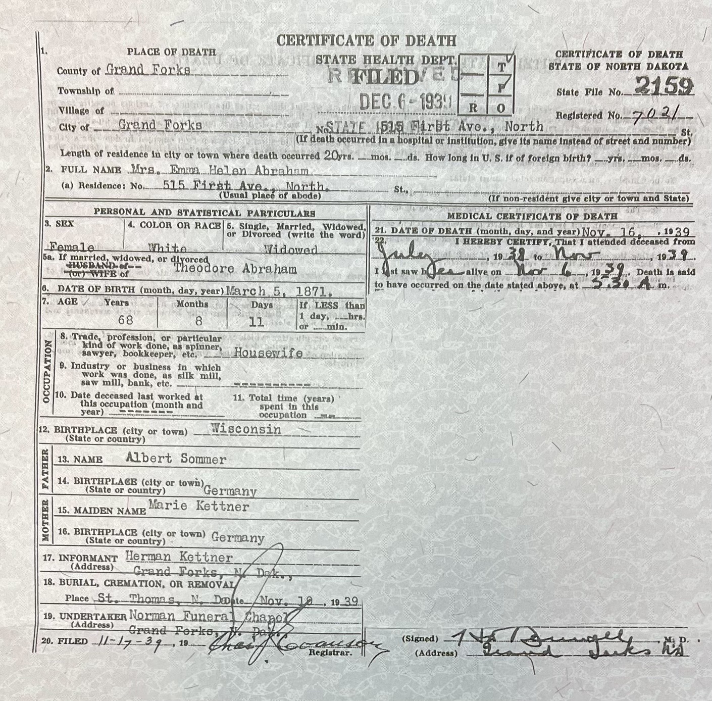 I was very excited to recieve two, new to me, death certificates on Christmas Eve. Merry Christmas to me! They are for my husbands great grandparents, Emma and Theodor Abraham. The best part is now I have his great great grandparents names. Emma’s parents are very clear and easy to read and they confirm what I had found for her already. Emma’s dad was Albert Sommer born in Germany. Emma’s mom was Marie Kettner who was also born in Germany.