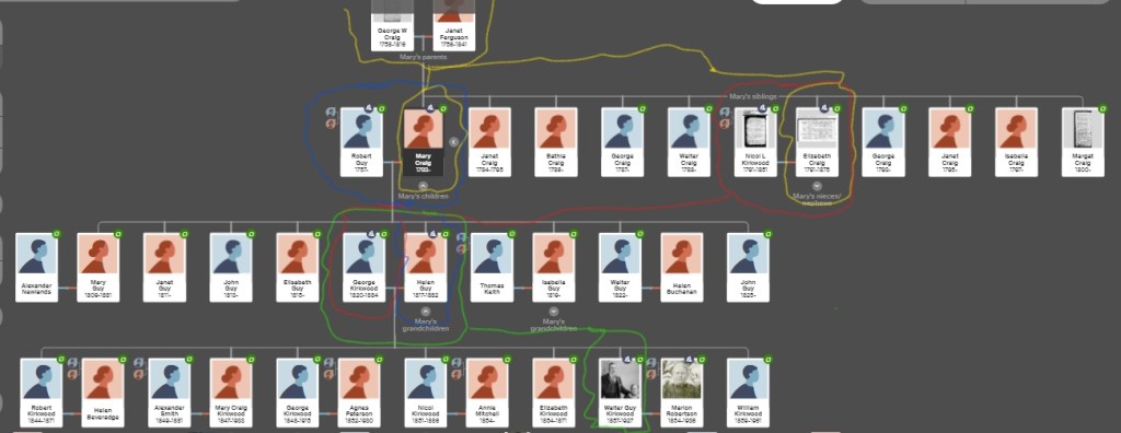 The yellow line shows Mary Craig and Elizabeth Craig connected to their parents George Walter Craig and Janet Ferguson. I am confident in this connection in my tree. The red line shows Elizabeth and her husband Nicol Kirkwood as the parents of George Kirkwood. The blue line connects Mary and her husband Robert Guy as the parents of Helen Guy married to George Kirkwood. I am confident in this connection too. Helen and George are the parents of Walter Guy Kirkwood who was definitely my great grandfather. I am sure Mary’s husband was Robert Guy but I am not sure I have the correct Robert Guy.
