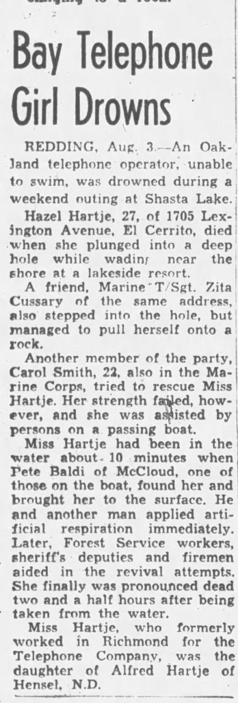 The only other information I have about Hazel is around her death. My husband never met her or her brother Lloyd as they both died much to young. Hazel’s death happened from a harmless trip to Lake Shasta. I have several articles about her death. The article I chose to post has a photo of Hazel and her friend Zita. The last name is different but I am wondering if she is the same Zita, Hazel was bowling with for the doubles tournament. Luckily for Zita she managed to get out of the water after the two of them stepped into a deep hole. It sounds like neither Hazel or Zita knew how to swim.